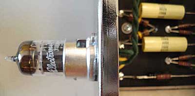 Apagamos el ampli, y metemos la rectificadora en su zócalo. A partir de este momento se nos van a cargar los filtros, y hay que descargarlos cada vez que volvamos a apagar el ampli, o tengamos que manipular el chasis. Volvemos a poner el ampli en ON, la bombilla lucirá a tope durante unos instantes, luego se irá apagando poco a poco. Es debido a que los condensadores se están cargando, cuando la intensidad de la bombilla se estabilice, estarán cargados. Todo dura más o menos en un par de segundos.