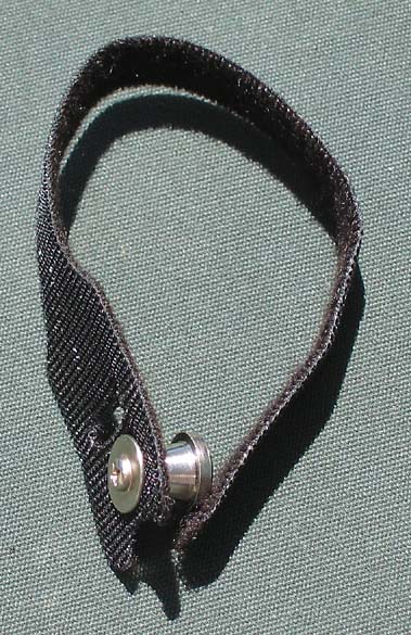 Fijáos en que se sustituye el típico cordón con un soporte de correa standard. Pues bien, estas bridas están tan adecuadas para esto que incluso tienen ya hecho el agujerito para pasar el tornillo de enganche del soporte de correa. Además son de un Velcro un tanto especial... nunca había visto uno que "se pegase" tanto. Es muy improbable que encontréis estas mismas bridas pero es que es muy fáciles hacérselas uno mismo. A partir de Velcro de dos caras os lo podéis hacer con unas simples tijeras. Fijáos cómo queda puesto:
