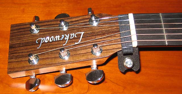 Mientras probaba el método del cordón en mi nueva Lakewood M1-CP se me ocurrió un método mejor de "quita y pon" a base de un anillo de Velcro alrededor de la pala justo donde tradicionalmente se pasa el cordoncillo. Conseguí un trozo de Velcro de ese que tiene "ganchitos" por un lado e "hilillos" por el otro. La cosa es muy fácil, lo cortas a medida del grosor del cuello de la pala, pasas el cordón ya anudado y enrollas el conjunto en la pala. Queda bastante fuerte y cómodo de usar. La verdad es que tampoco es que sea una idea genial pero cumple con la función muy bien además de ser barato y fácil de conseguir.