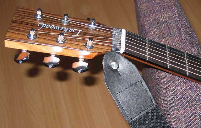 Normalmente las guitarras acústicas no llevan más que un soporte de correa en el extremo opuesto a la pala. El "endpin" que dicen los guiris. Si queremos colgárnosla del hombro hemos de recurrir al viejo truco del cordón de zapato o similar. La verdad es que funciona muy bien y es muy simple y barato pero, la verdad, es un coñazo el andar atando y desatando el nudito cada vez que queremos quitar la correa.