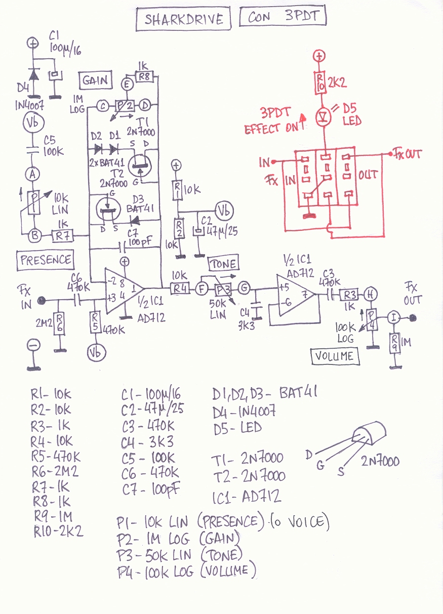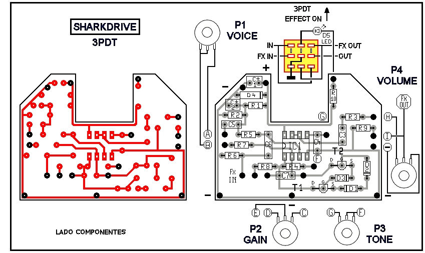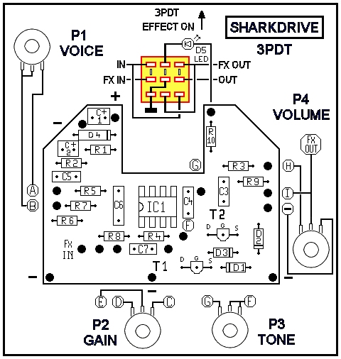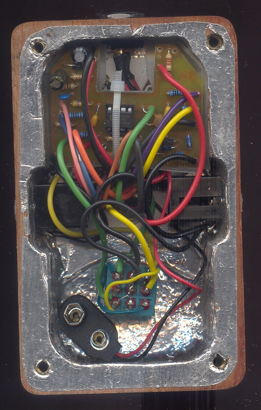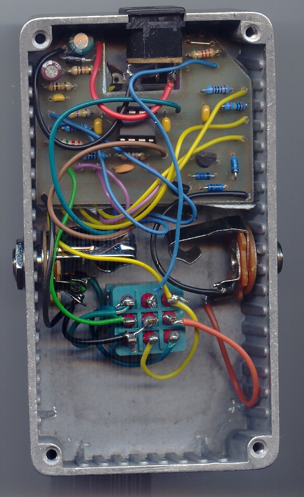 Con este aparato me ha ocurrido algo raro. Lo he montado con un conmutador triple (3PDT) porque el Millenium True Bypass presenta un problema: NO ES TRUE BYPASS. Cuando el pedal está en modo bypass se oye (perfectamente) un pitido que va variando cuando giramos los controles. Ya sé que no debería ocurrir, pero ocurre. Se dio cuenta mi hermano, que es muy tiquismiquis. Monté otra unidad y el problema se repetía. Rápidamente sometí a examen TODOS los pedales que tengo con el Millenium. No he encontrado ese defecto en ninguno de ellos pero este problema me ha replantearme las cosas. Yo usaba el Millenium True Bypass porque desconfío de los conmutadores triples. Son (o eran) más caros que el DPDT y me he encontrado algunos que tenían estropeado alguno de sus tres circuitos. Por otro lado, también es verdad que con un 3PDT se simplifica el montaje ya que te ahorras el transistor y el diodo. Además, he encontrado un modelo en Musikding.de que tiene un tamaño similar al DPDT y es bastante barato.