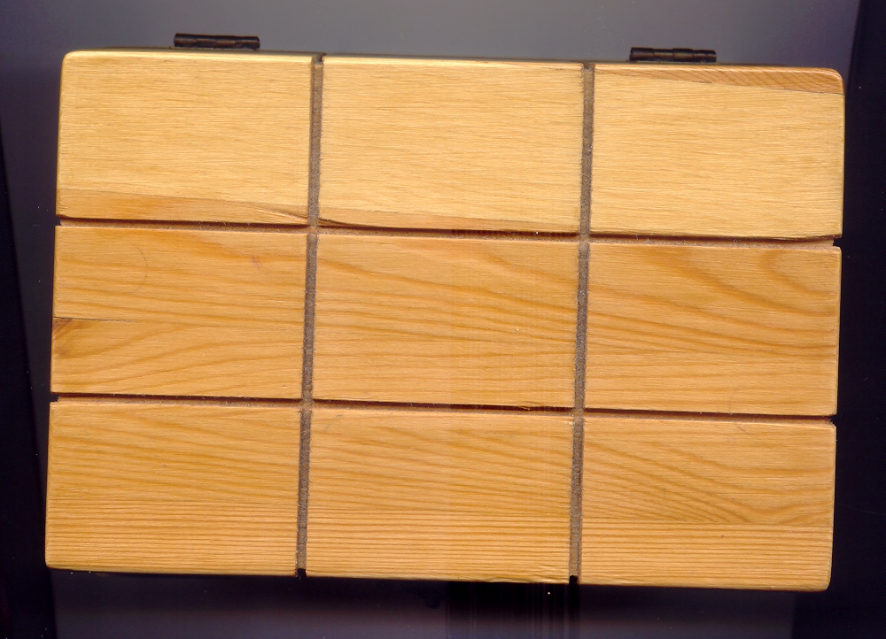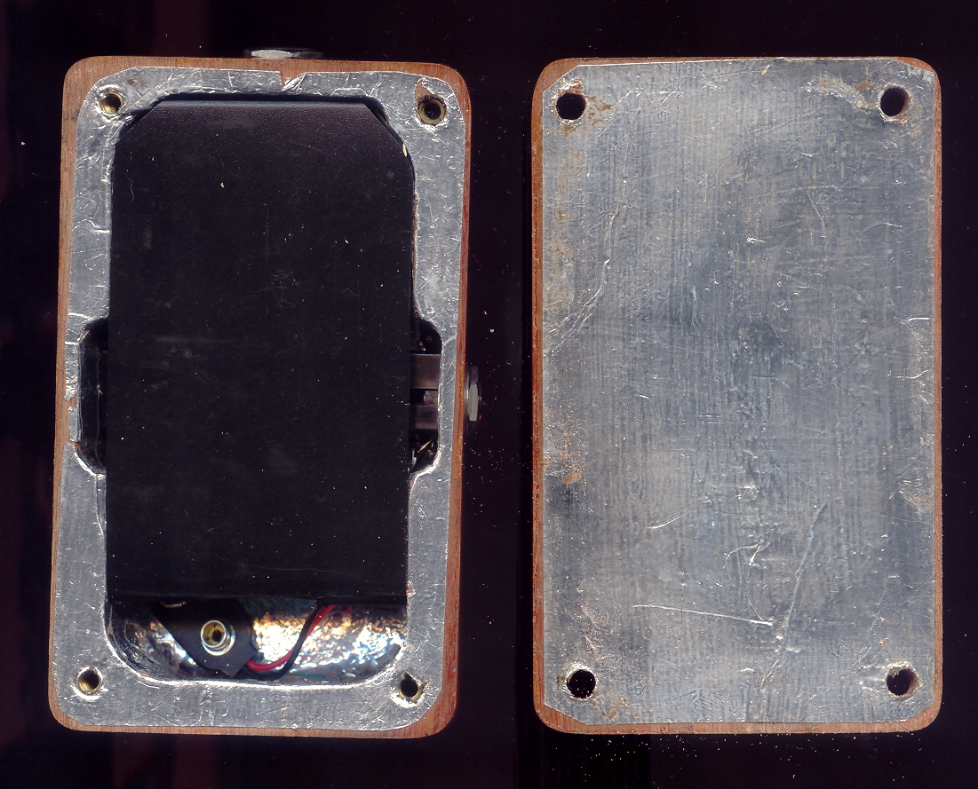 Os presento también una versión realizada en madera de iroco, en plan pedal de boutique. El iroco es una madera tropical de gran resistencia y que soporta muy bien la humedad. Se usa en marinería y en puertas y ventanas exteriores. Cada pedal se ha realizado vaciando un solo taco de madera, lo que les confiere gran solidez. La tapa inferior sigue la veta del resto del aparato, lo que lo convierte casi en un mueble de lujo. Los letreros están grabados con láser y la madera ha sido pulimentada a muñequilla. El interior está revestido de papel de aluminio adhesivo para evitar interferencias. Lleva unos bonitos botones de aluminio pulido, como podéis ver en las fotos.