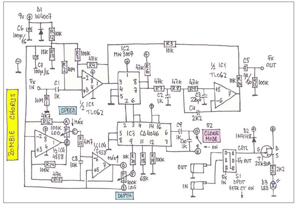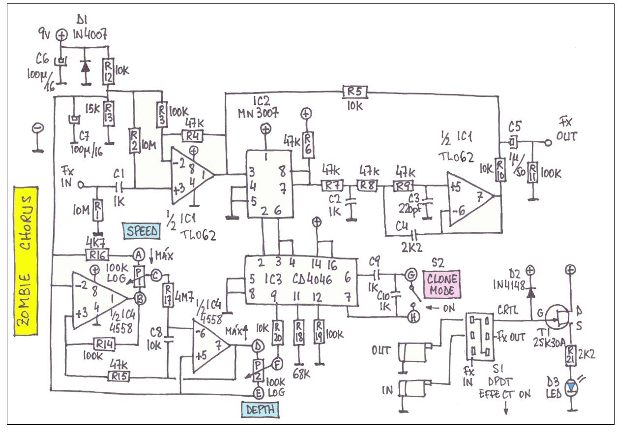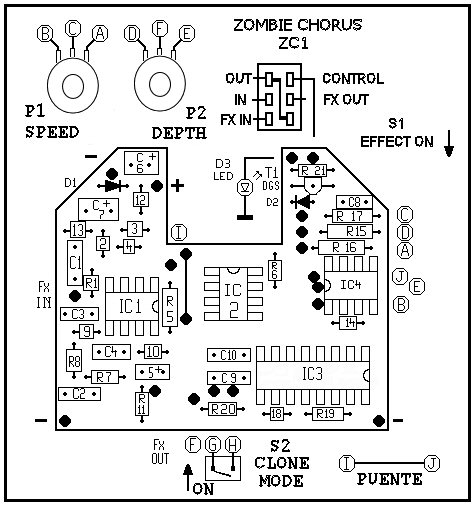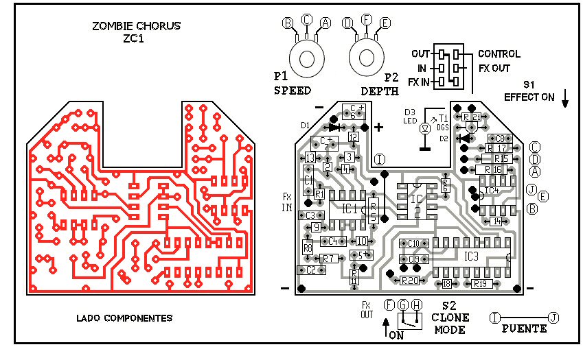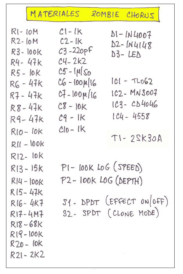 Antes que nada quiero comentar que esta colaboración es sólo una ampliación, como ya he hecho otras veces, de artículos que ya se han publicado en esta página. Me refiero en concreto al Zombie Chorus de Martín Luciano Bello, colega del otro lado del charco grande. Leed ese artículo para ampliar detalles que aquí no se cuentan ya que, como en esas otras ampliaciones de las que hablo ( Fender Blender, Big Muff Pi y Tube Screamer TS-808), sólo pretendo ser una alternativa y, quizás, animar a los indecisos a que se monten estos magníficos efectos mostrando alguna nueva idea y tal.