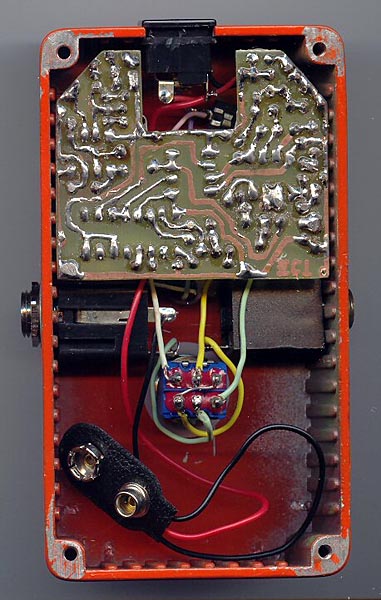 Solventado el problema del integrado, y asumiendo que el conmutador DPDT también lo tenemos (pasaos por www.musikding.de, que tienen los de la marca Alpha a buen precio) os comento algunas particularidades de la placa que os propongo. Aunque tiene la misma forma de mis otras placas, veréis que es 3 mm más larga. A pesar de ese aumento de tamaño, he podido colocar el resto de elementos (bases de jack, DPDT, base de alimentación, etc.) en la misma posición de mis otros montajes. La pila también cabe aunque, como digo siempre, es mejor el alimentador. La caja, la habitual Retex RI-413. El acabado exterior admite críticas.